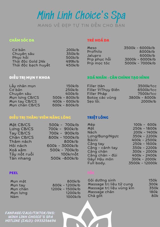 Minh Linh Choice’s Spa là một tiệm làm đẹp cung cấp các dịch vụ spa khác nhau, từ spa dưỡng ẩm, trị mụn đến spa thư giãn. Bạn sẽ được sử dụng các sản phẩm chất lượng cao, an toàn và hiệu quả. Bạn sẽ được thưởng thức không gian yên tĩnh và thoải mái, giúp bạn xua tan mọi căng thẳng và mệt mỏi. hãy liên hệ với Minh Linh Choice’s Spa ngay hôm nay để đặt lịch hẹn và được phục vụ tận tình nhé!